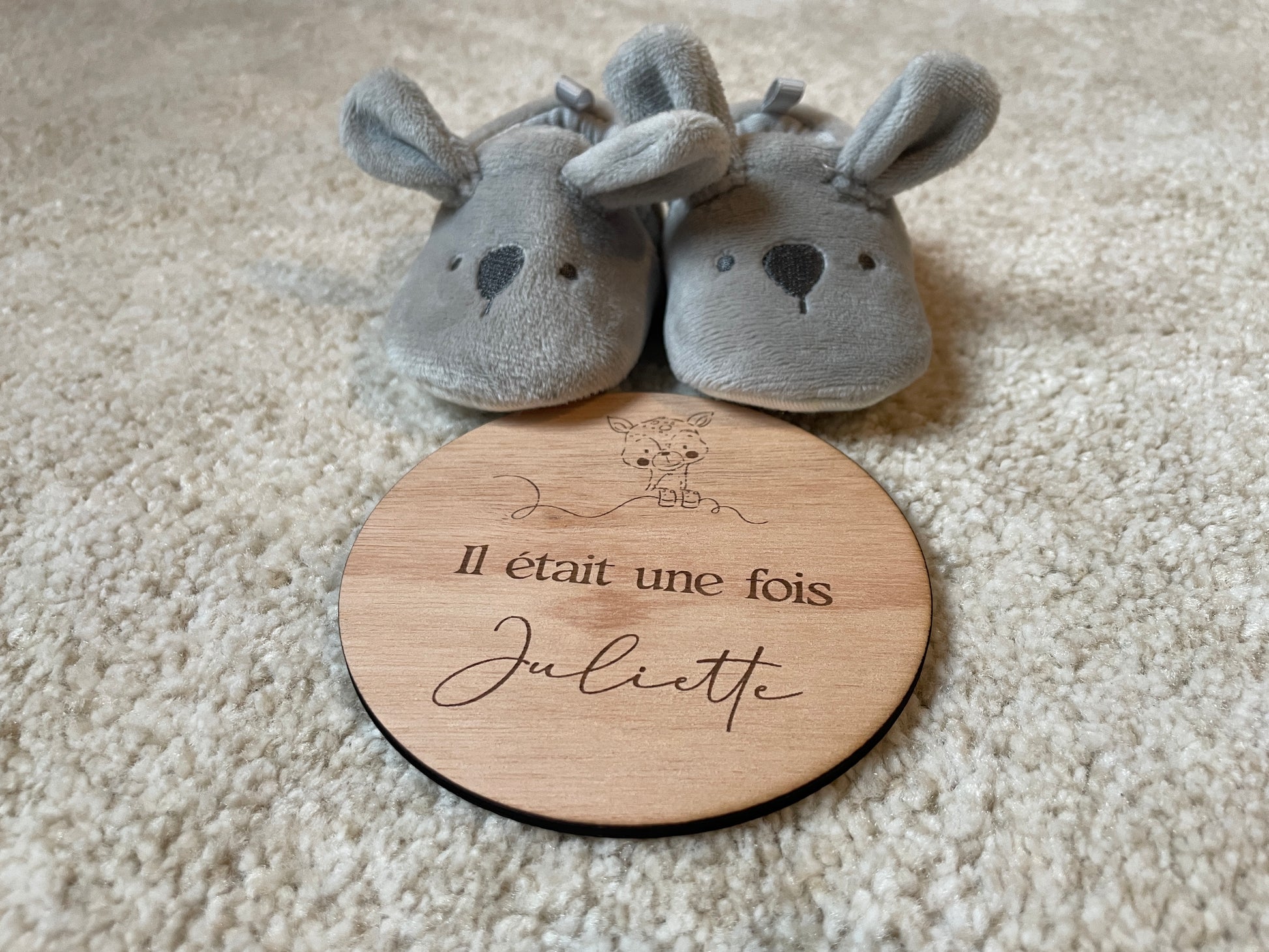 Fabriquée en bois naturel 🌳, cette plaque est gravée avec soin et affiche un joli design avec une illustration tendre 🐾 et la phrase "Il était une fois", suivie du prénom de votre choix.