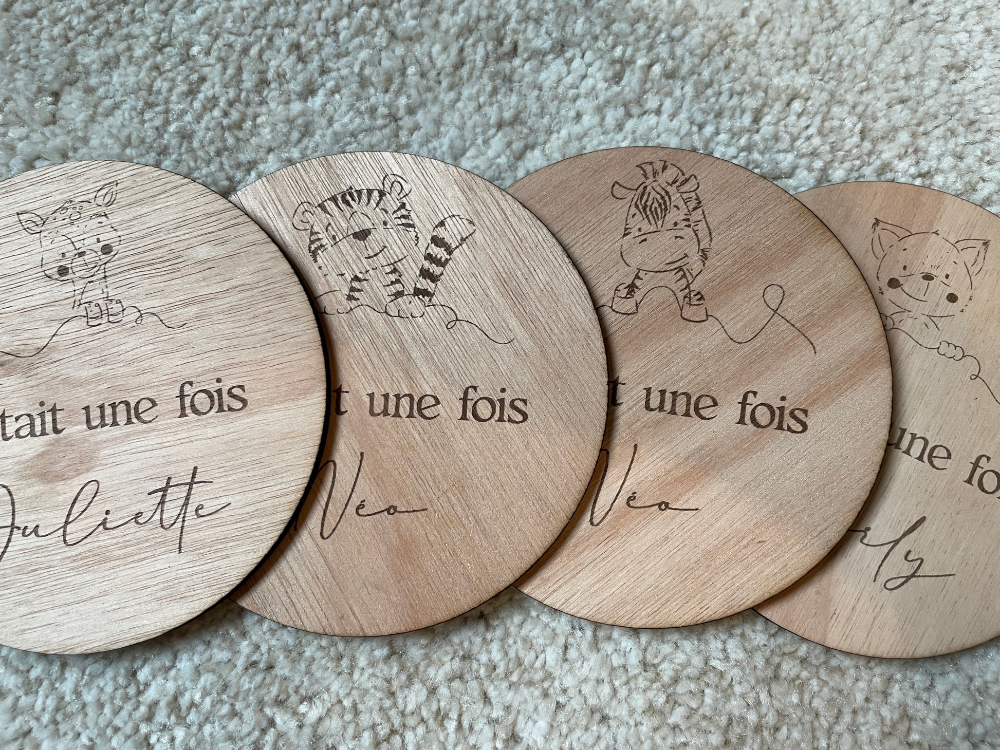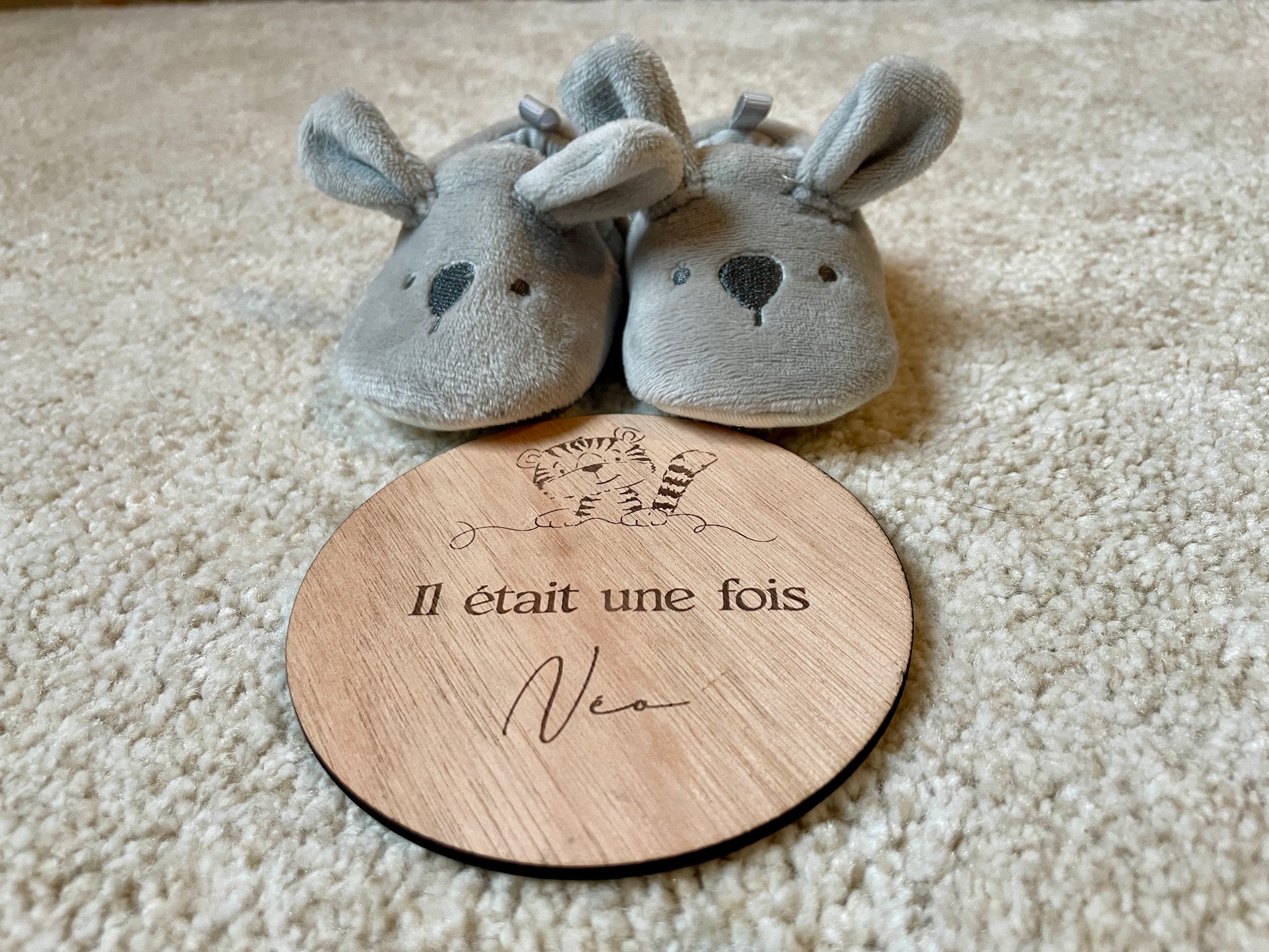Fabriquée en bois naturel 🌳, cette plaque est gravée avec soin et affiche un joli design avec une illustration tendre 🐾 et la phrase "Il était une fois", suivie du prénom de votre choix.